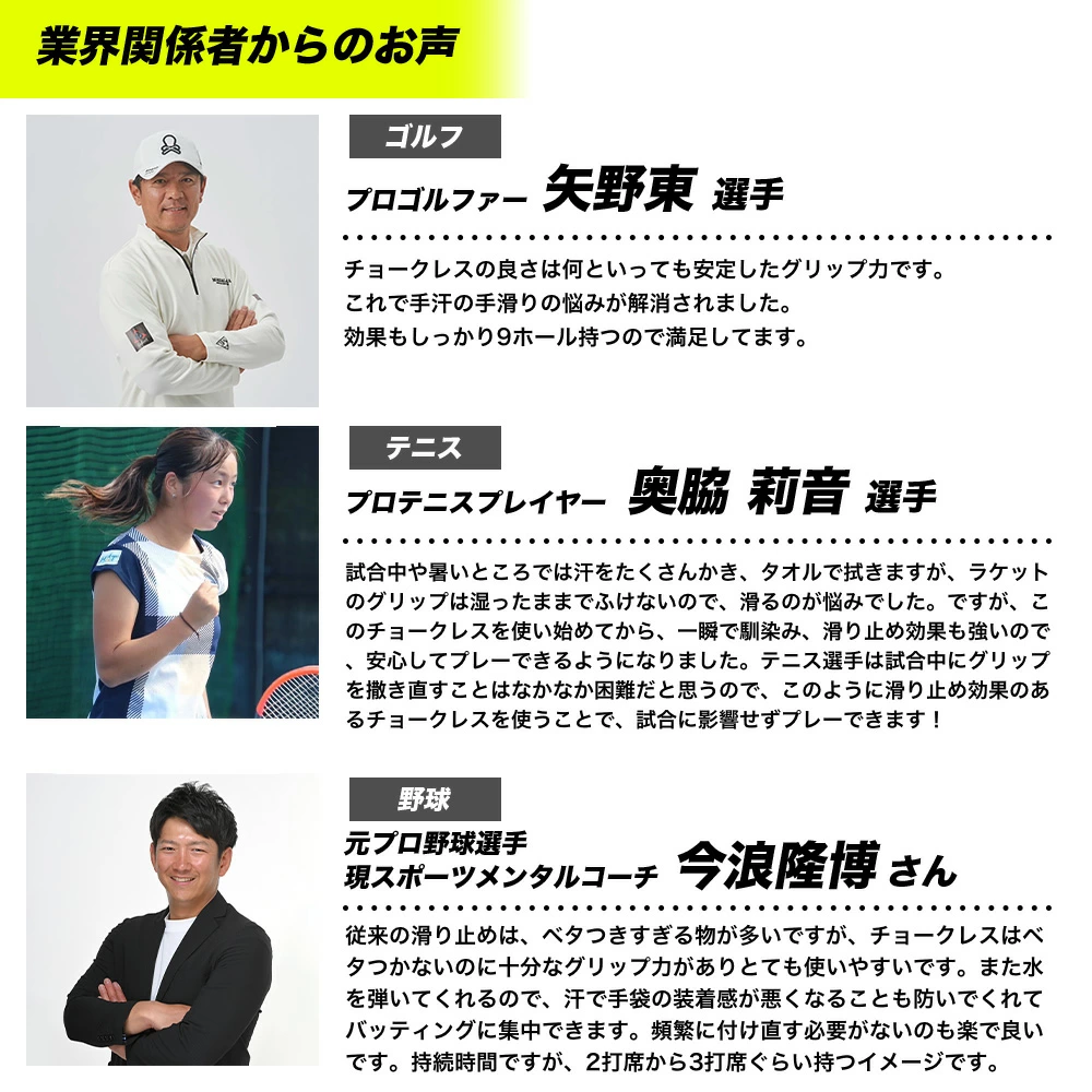 使用方法 | 本製品は滑り止めです。半透明で見えにくいため使用する際はご注意ください。乾いた状態の手に適量(ひとつまみ程度)を取り、細かい粒が無くなるまですり潰しながら伸ばしてご利用下さい。ご使用後は石鹸などで簡単に洗い流せます。 ※1回あたり適量をひとつまみ程度(0.05g)として約5回分です。しかしながら、手のひらの皮脂量は個人差があるため、適量でグリップ力が足りない場合は、使用量を増やすなど調整をお願いします。 ※使用方法や個人差により、実際の使用回数は異なる場合がございます。 |